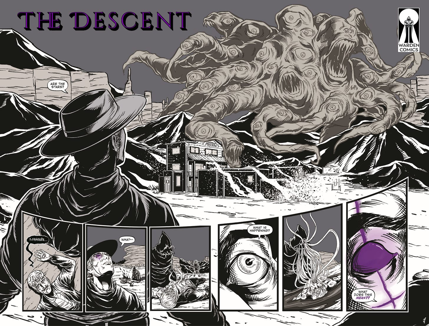 I already had an idea for a cosmic horror story featuring Alban of the West, a reinterpretation of “The Dunwich Horror” that introduced a new color for his mysterious right eye and powers that he didn’t fully understand. My pitch to the editor was for “The Descent,” a six-page comic: “A lone gunman with supernatural powers rides into the Old West town of New Dunwich. After unsettling interactions with the residents, he is confronted with terrifying knowledge of the cosmos unlike anything he has ever experienced. Before he descends completely into madness, [spoilers].” I can’t give away the ending here! You’ll have to get the anthology to find out what happens next.